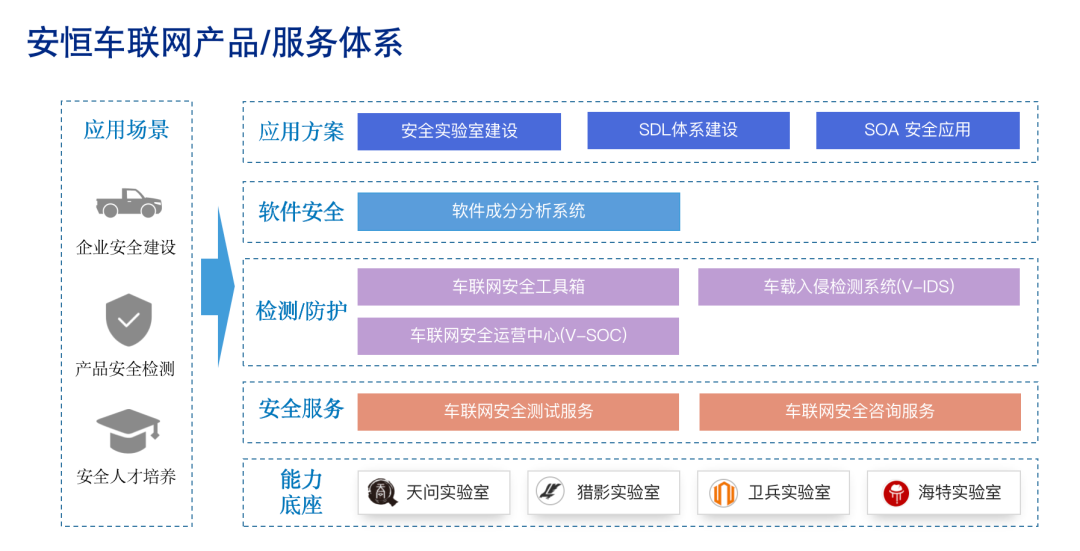 安恒信息多年来在车联网安全领域做了深入研究,以整车测试、车辆漏洞挖掘、车载网络、无线蓝牙、软件分析以及安全测试工具箱等方向的深厚研究成果为基础,围绕“云、管、端,芯”一体化纵深安全防护体系建设为核心目标,涵盖车联网安全实验室、安全检测防护能力、专业人才培养等多方位的安全建设需求,为用户提供全方位的车联网安全建设能力支撑,能够切实做到早发现,早预警,降损失。