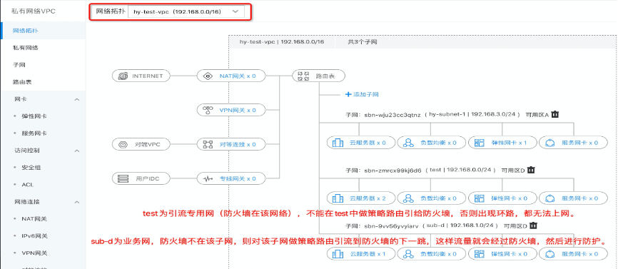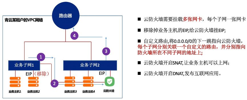 通过以上配置既可以解决高可用问题,同时因多台云防火墙可同时工作又解决了高性能问题。缺点是它只能解决从外到内防护的问题。