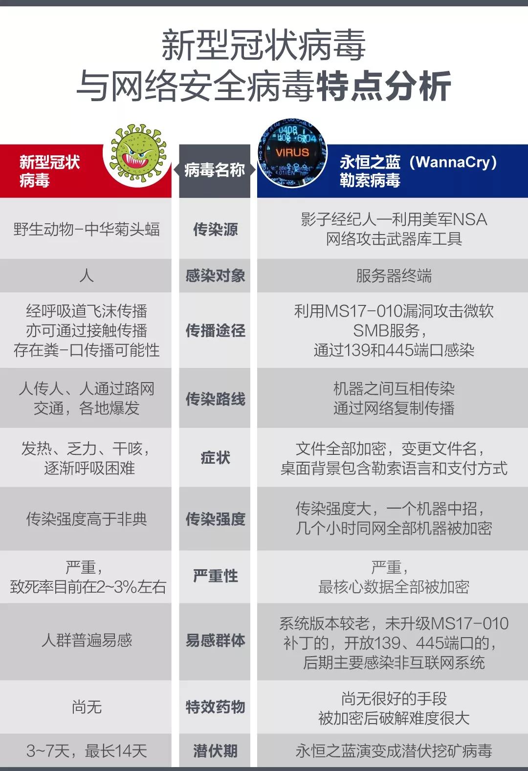 这里以永恒之蓝勒索病毒为例,在对新冠病毒与永恒之蓝勒索病毒的传播途径、传染路线、感染对象等方面的对比分析可以发现,新冠病毒传播的爆发与网络安全攻击具备一定的相似性: