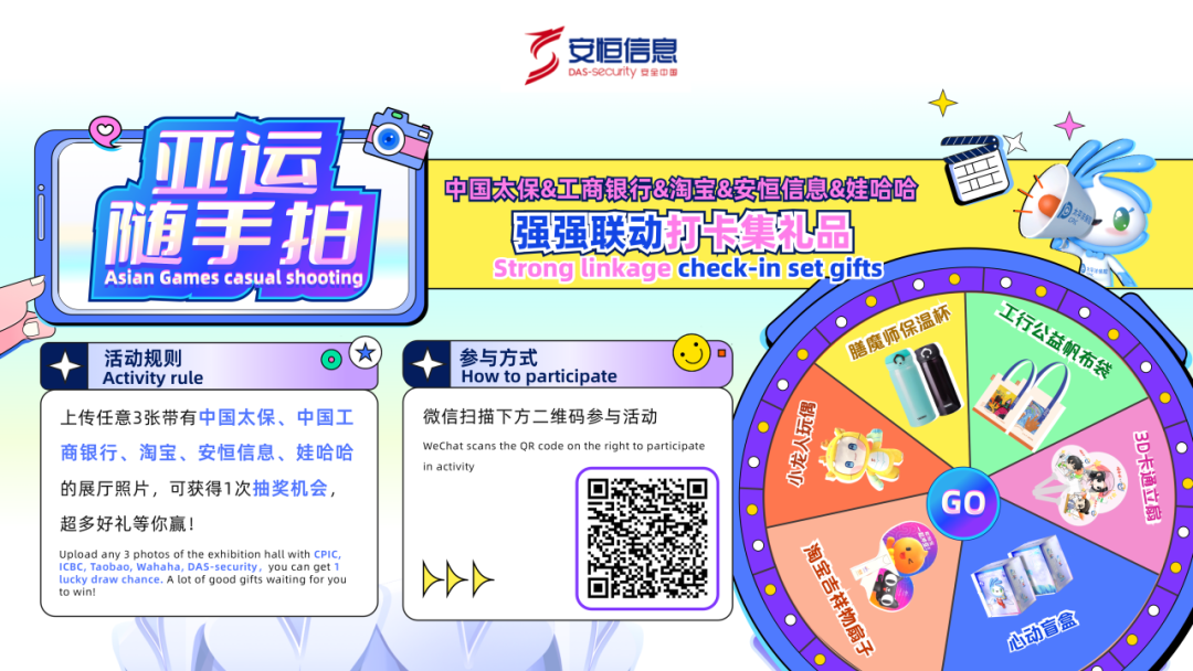 在展馆现场,安恒信息联合中国太平洋保险、中国工商银行、淘天集团、娃哈哈多家亚运赞助企业,开启“亚运随手拍”活动,上传展厅照片,即可参与抽奖!微信扫描下方二维码,超多好礼等你赢!
