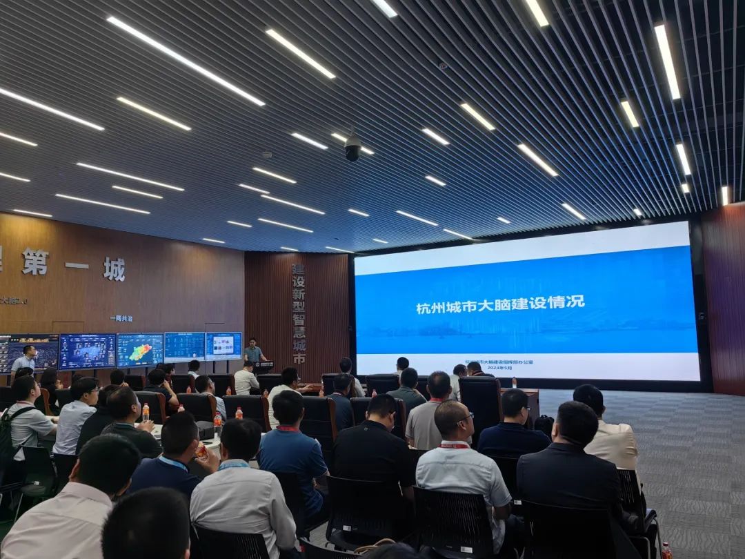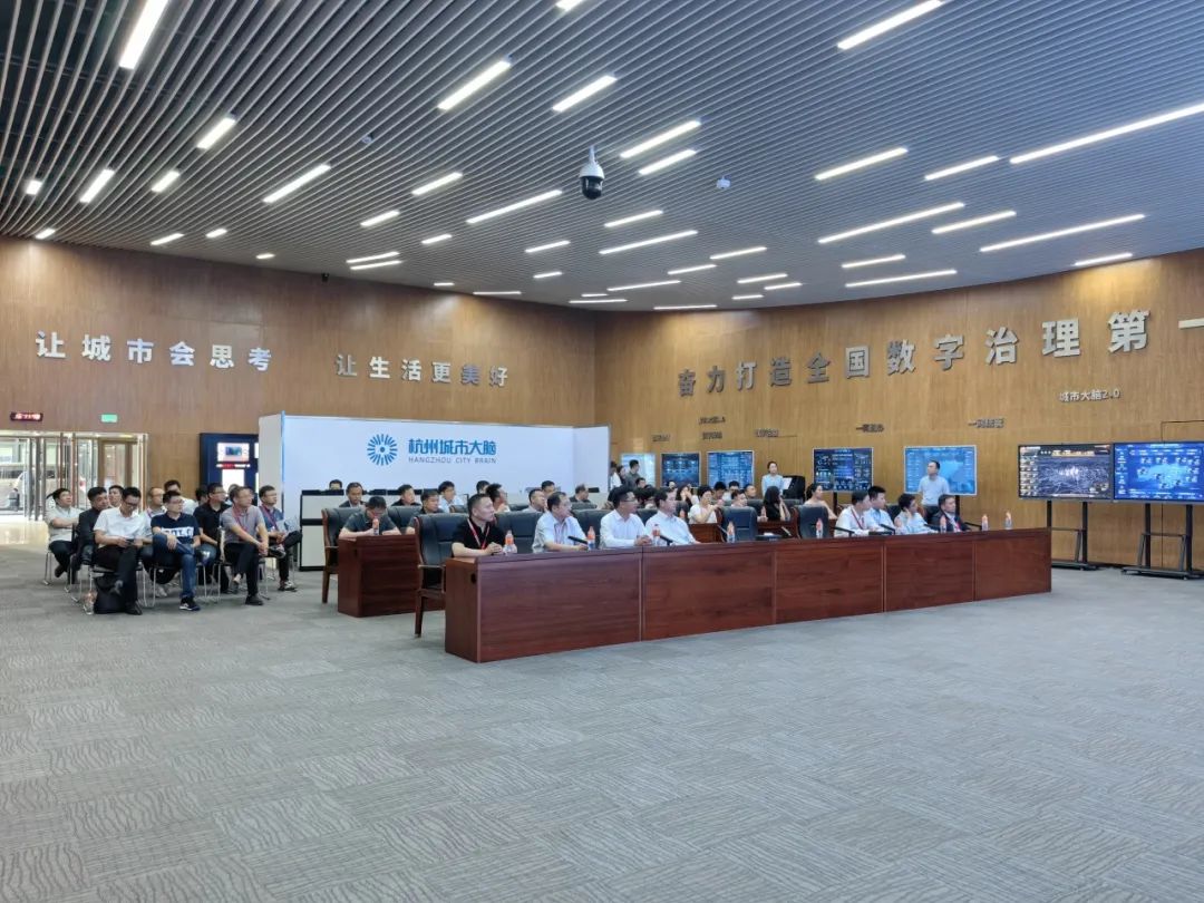 之后调研团参观了杭州城市大脑运营指挥中心2050厅,并现场聆听了杭州市数据资源管理局副局长傅卫权《杭州城市大脑建设情况》的主题报告。他首先详细介绍了杭州城市大脑1.0到2.0的建设理念和建设路径,重点阐述了亲清在线、先离场后付费、一老一小、智能亚运等优质场景的建设经验,回答了杭州如何通过城市大脑来提升城市治理现代化水平
