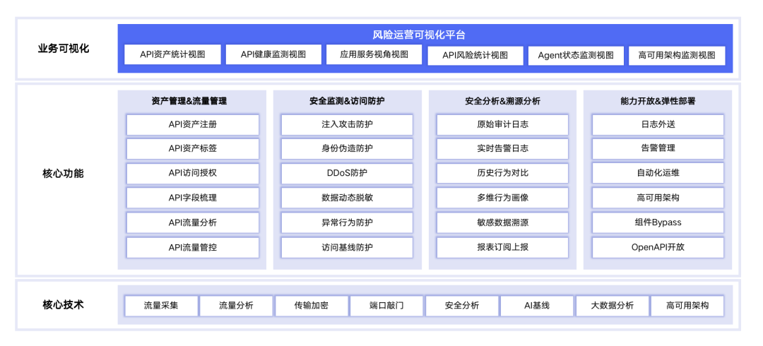 某运营商大数据中心,负责为集团各部门业务单元提供集团级的业务API数据服务。急需构建一套行之有效的API调用运营体系,确保其在传输链路、身份控制、调用鉴权、行为监测、数据保护、风险回溯和预警处置等各环节具备安全防护能力,防范“未授权调用”、“授权违规调用”、“敏感数据泄露”等核心安全场景的隐患,并实现可视化风险管理。