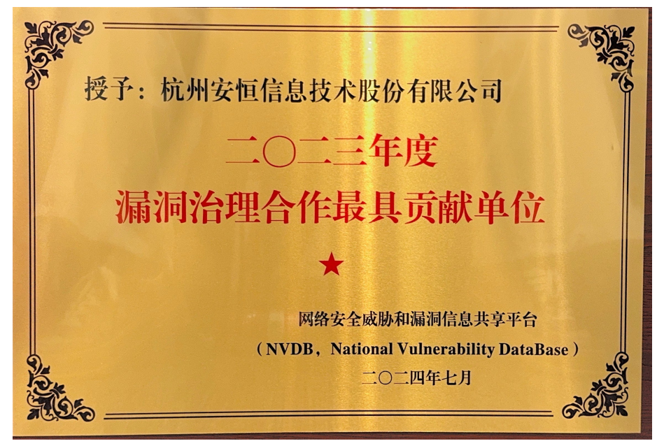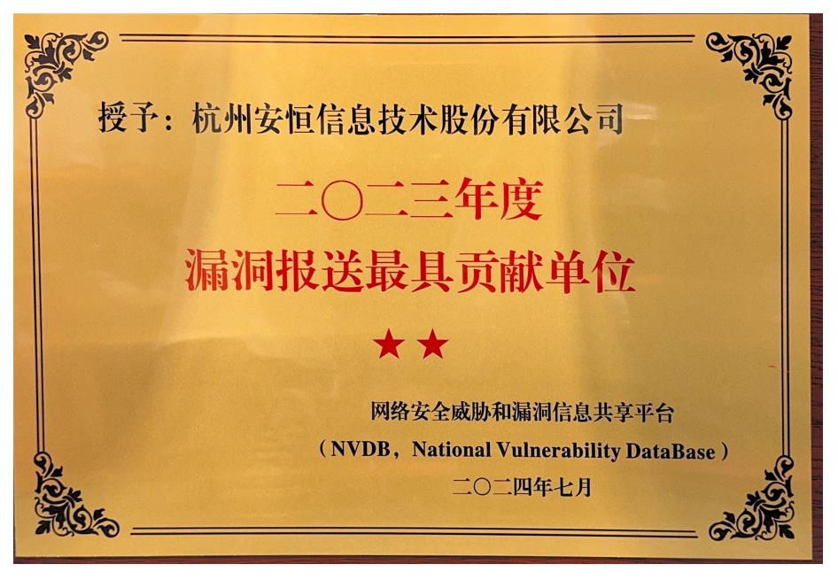 近日,工业和信息化部网络安全威胁和漏洞信息共享平台(NVDB)对2023年度在网络产品安全漏洞管理方面作出杰出贡献的单位进行表彰。安恒信息凭借在漏洞研究领域的卓越实力荣膺“2023年度漏洞报送最具贡献单位”与“2023漏洞治理合作最具贡献单位”双料荣誉。